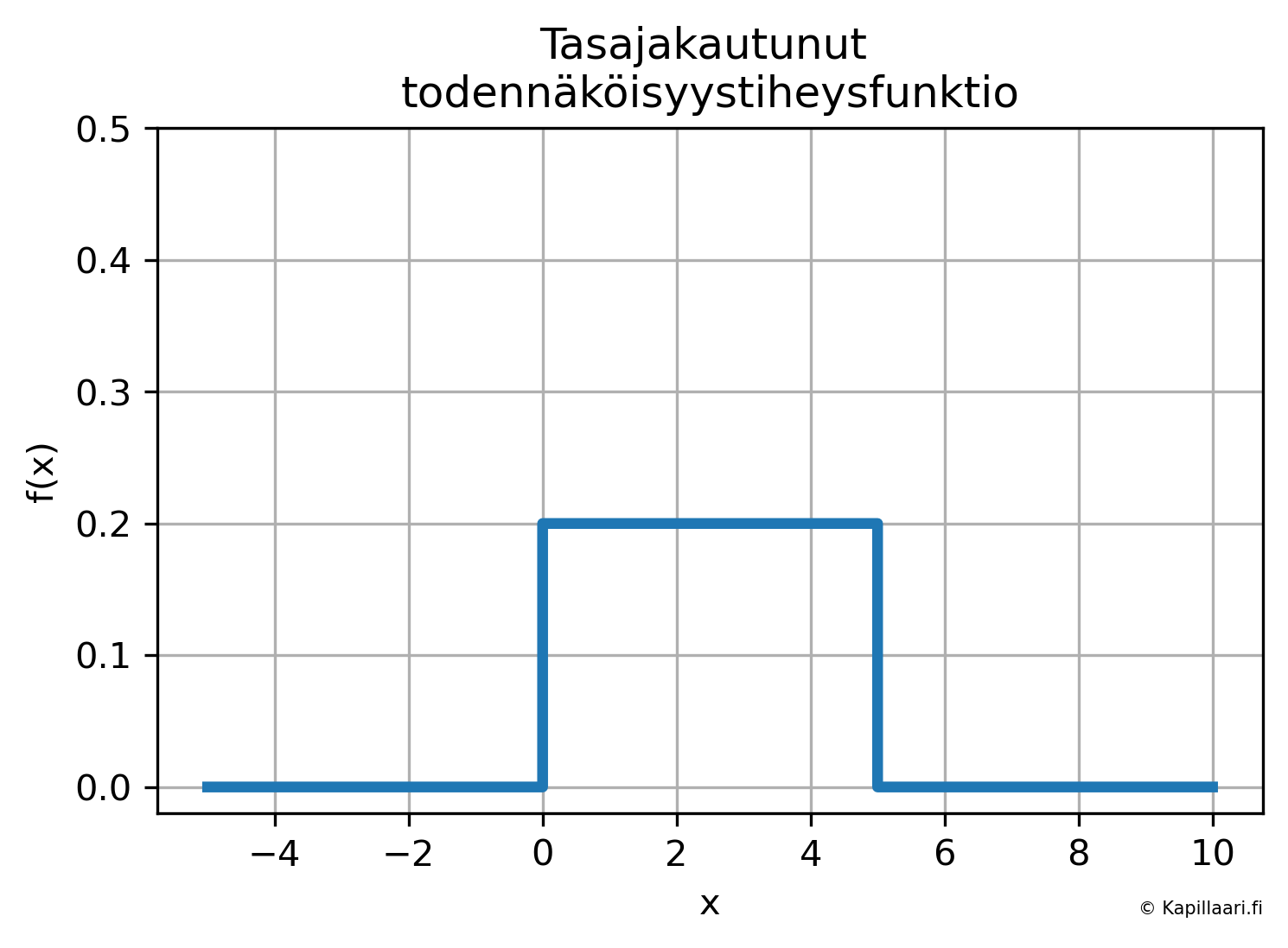Fig. 11 Esimerkki tasajakaantuneesta todennäköisyystiheysfunktiosta, joka saa nollasta poikkeavia arvoja välillä 0…5. Viivan alle jäävän alueen pinta-ala on yksi.#