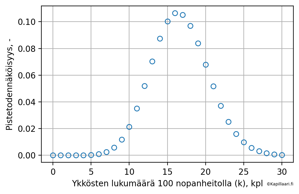 Fig. 15 Binomijakauman pistetodennäköisyysfunktion kuvaaja, jossa on esitetty ykkösen esiintymiskertojen todennäköisyyksien jakauma heitettäessä noppaa 100 kertaa.#