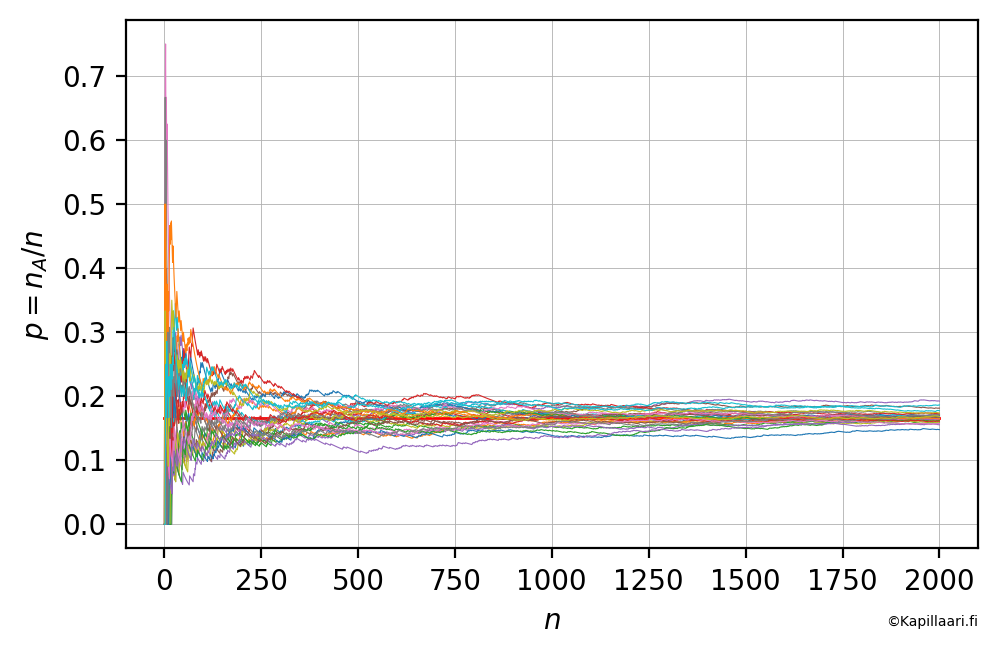 Tehdään pythonilla laskelma, jossa heitetään yhtä noppaa uudestaan ja uudestaan ja kirjataan jokaisen heiton jälkeen talteen siihen mennessä kertynyt ykkössilmäluvun suhteellinen osuus \(p = n_A / n\). Seuraavassa kuvassa on esitetty 30 tällaisen laskelman tulos ensimmäiseltä 300 heitolta.